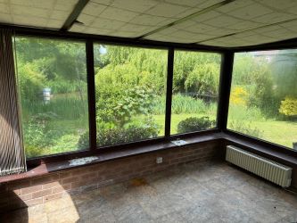 The property requires full modernisation throughout, offering significant scope for improvement and reconfiguration, subject to the necessary consents. The current layout includes a spacious living/dining room, modern fitted kitchen with built-in oven and ceramic hob, and a sun room that overlooks the rear garden—offering a peaceful setting with views of the adjoining pond. The inner hallway leads to three bedrooms, including a master with en-suite W.C., and a separate family bathroom.