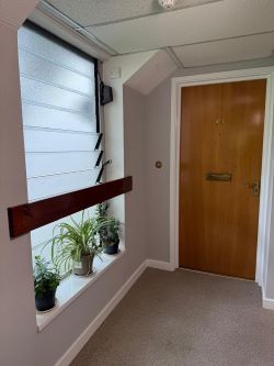 Positioned at the rear of the building with convenient lift access, the property features a spacious lounge with a feature fireplace and storage cupboard, plus a fitted kitchen with integrated oven, hob, fridge and freezer.
