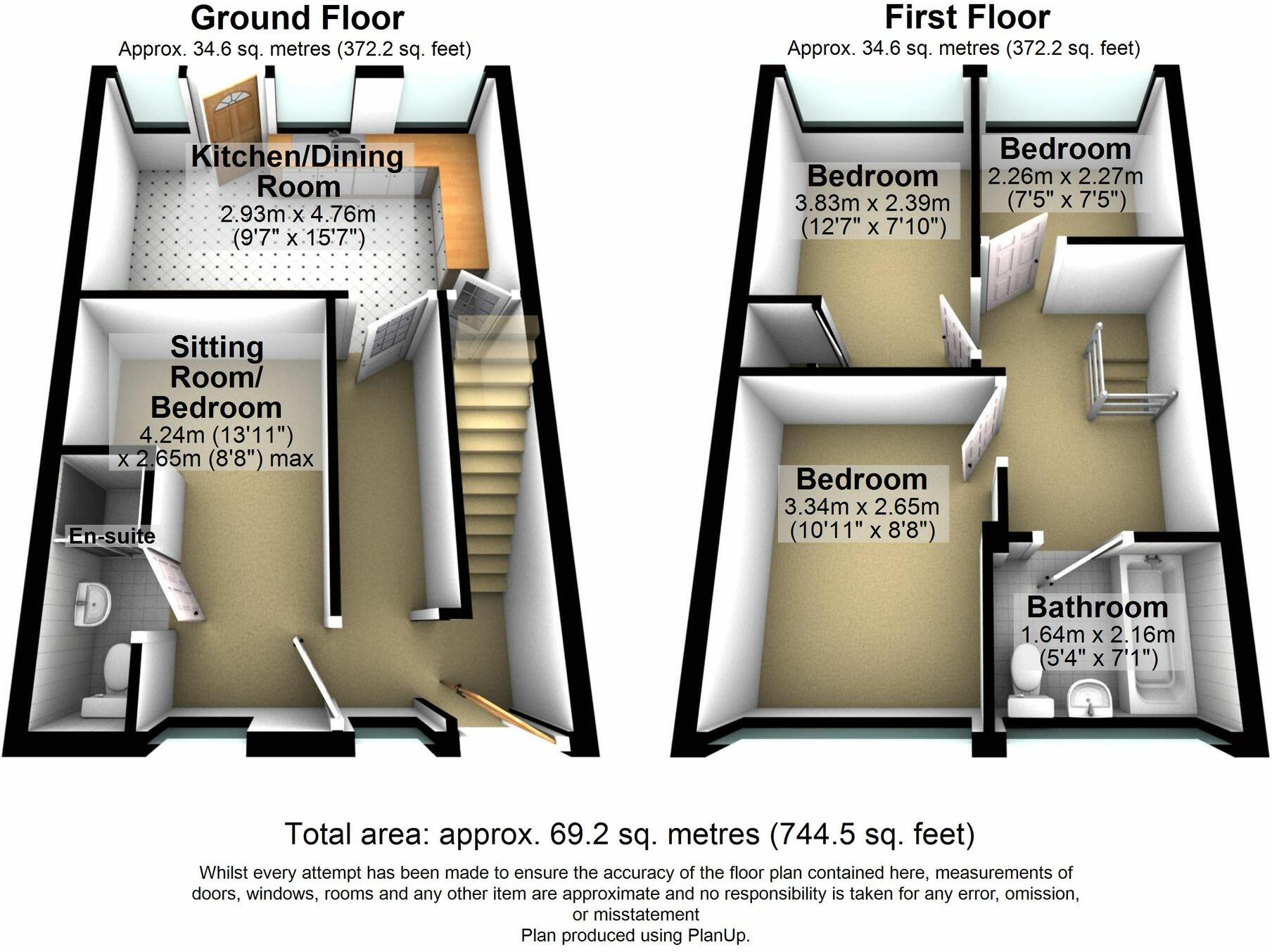 The ground floor briefly comprises an entrance hallway, a living room/bedroom with en-suite, and a fitted kitchen with a breakfast bar. Upstairs, there are three bedrooms and a family bathroom with a three-piece suite.