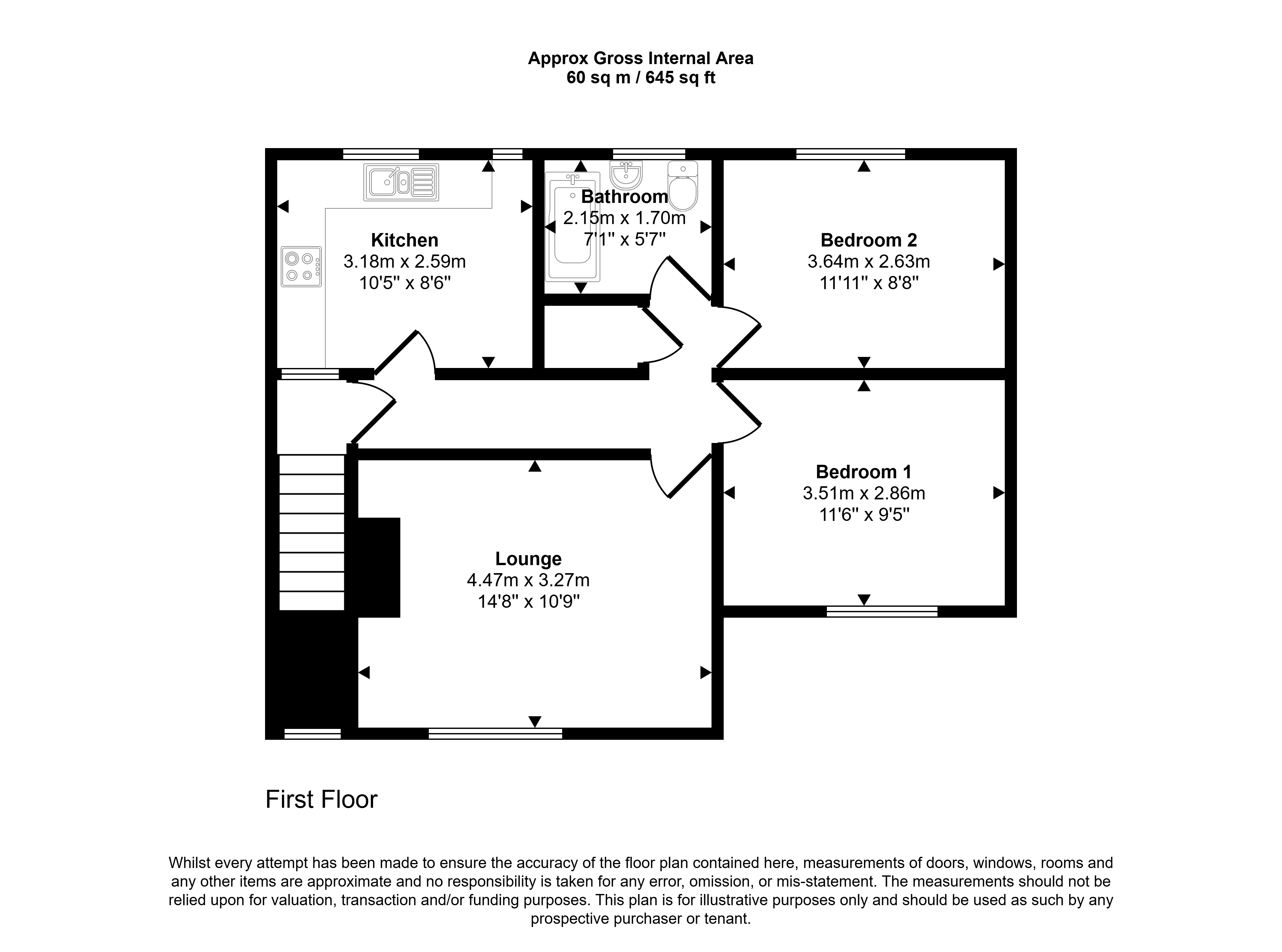 • Bedroom 2 (3.64m x 2.63m): A comfortable second bedroom, ideal for a guest room, home office, or child’s room.