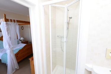 Four-poster double room with bay window seating overlooking front garden. En-suite shower room.