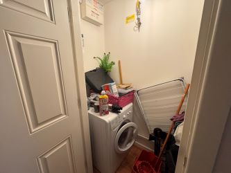 Cloakroom housing boiler with space for a washing machine.