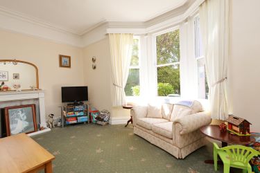 Spacious front-facing lounge with bay window, picture rail, decorative coving, and central ceiling rose.