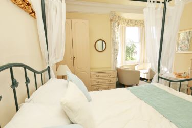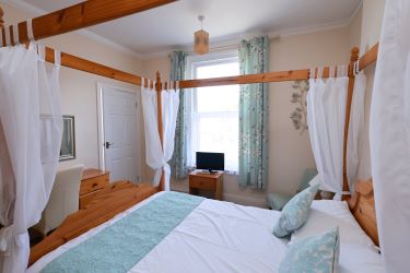 Four-poster double room with bay window seating overlooking front garden. En-suite shower room.