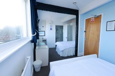 Family room with double and single beds. Uninterrupted sea views across the bay.